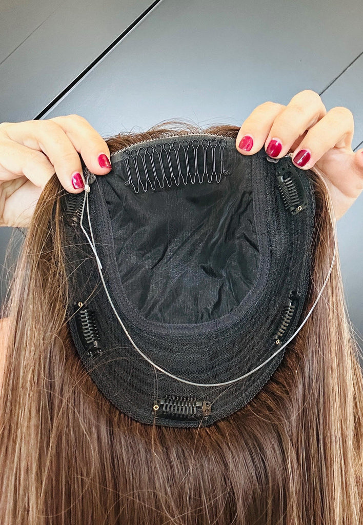 OLIVIA 14 Premium Remy Human Hair Topper w/Halo | 14” Skin Top | 7.5x7.5 Mid-Low Density | Warm Brunette with Golden Highlights Final Sale