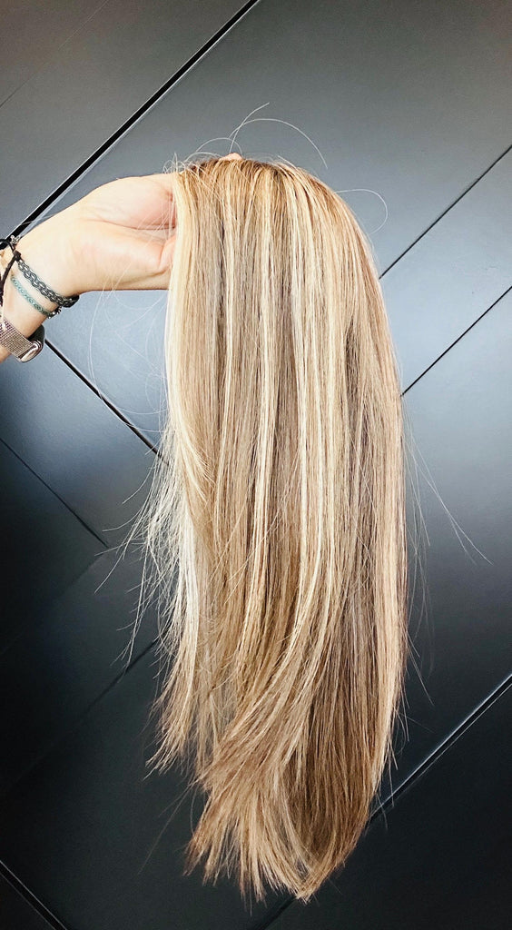 This topper is crafted in a medium brown base with soft golden highlights, giving a sun-kissed glow and natural dimension. The blend creates depth and movement while keeping the look sophisticated and versatile.